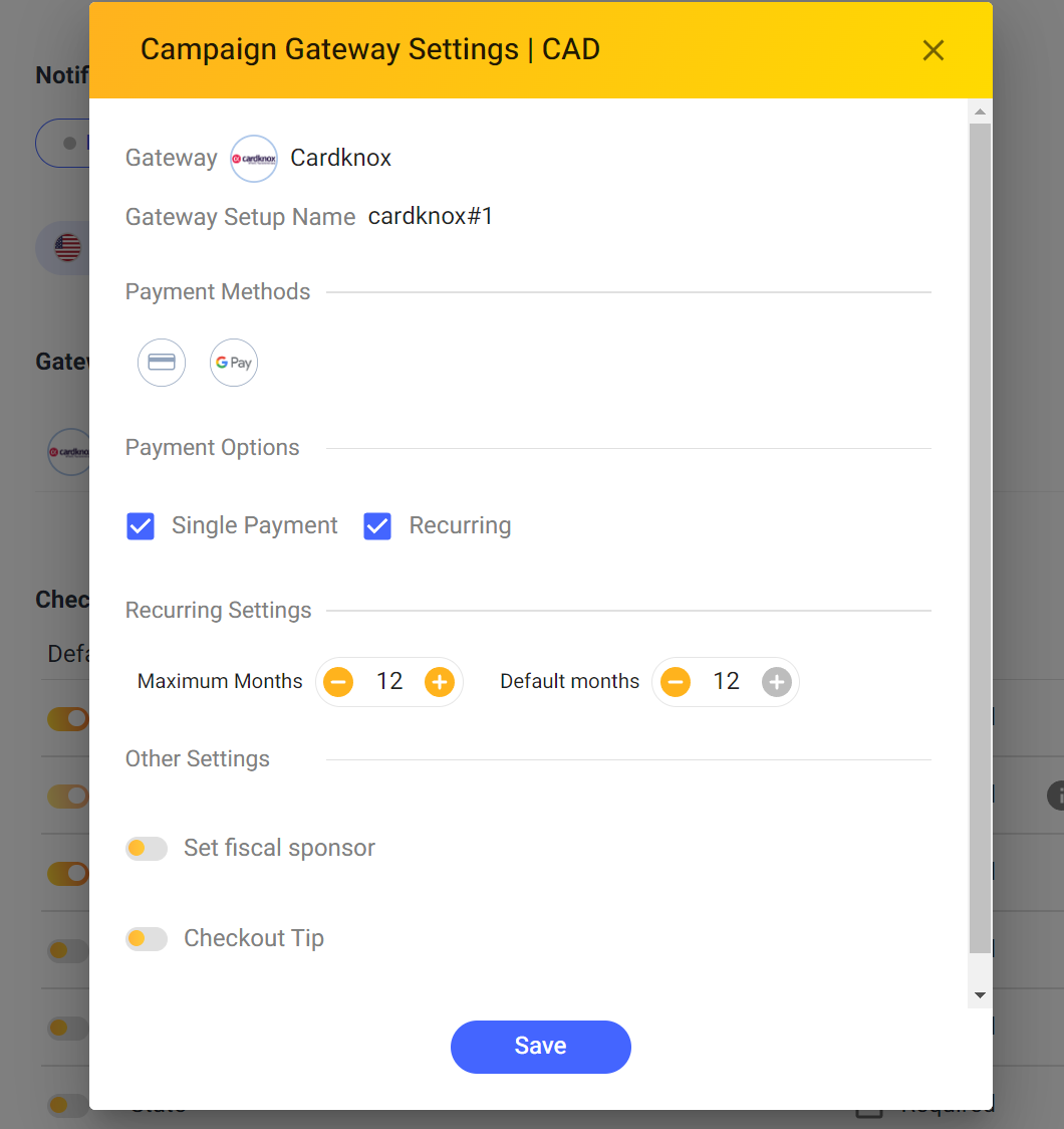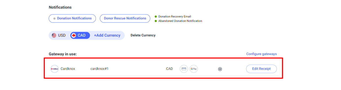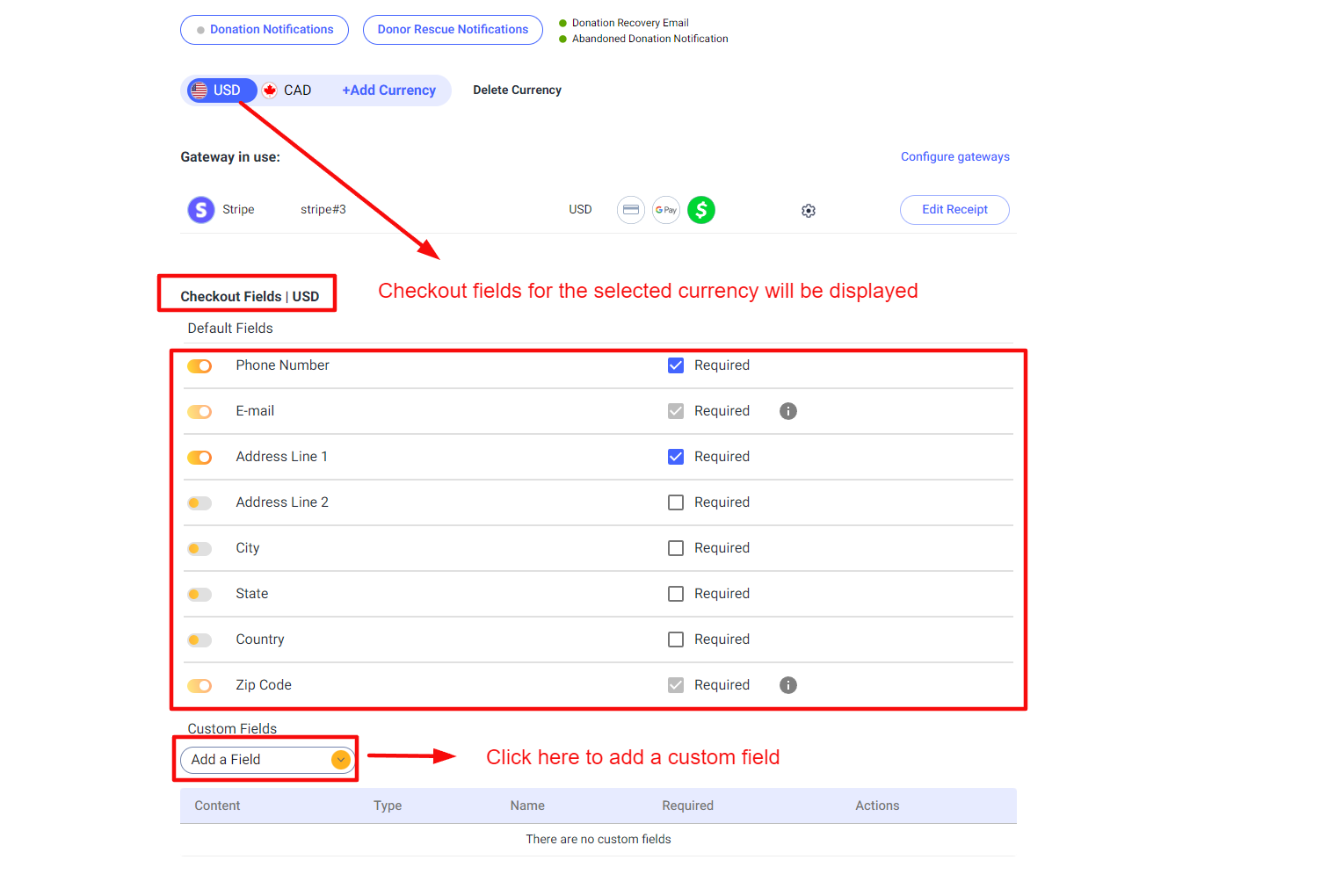 The Checkout section enables you to customize every aspect of your campaign's checkout process. You can add currencies, configure payment gateways, edit receipts, and set up donation notifications, as well as donor rescue notifications.