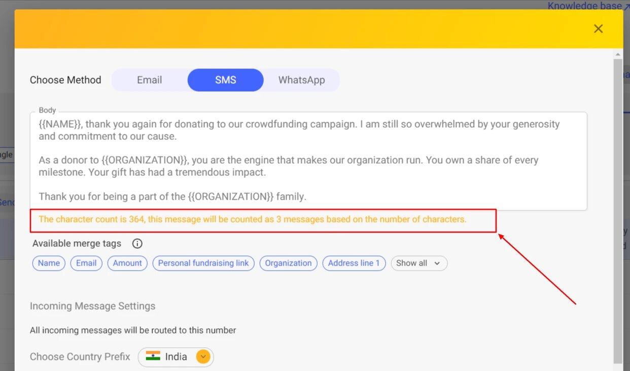 A Segment can have 160 characters. The message may be split into several segments based on the language and number of characters. It depends on the use of emojis, images, merge tags, non-latin characters etc. Under the SMS text editor we have a counter that counts the characters and will show that the message will be counted as x number of messages based on the number of characters based on Twilio logic. Text will be displayed in yellow color.