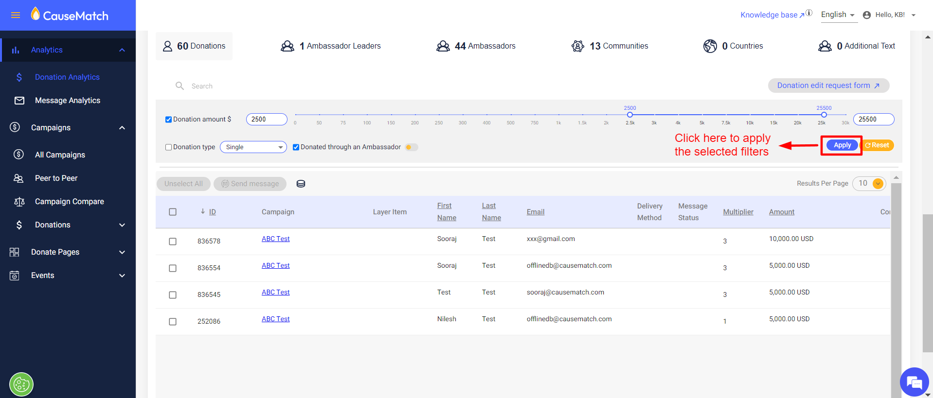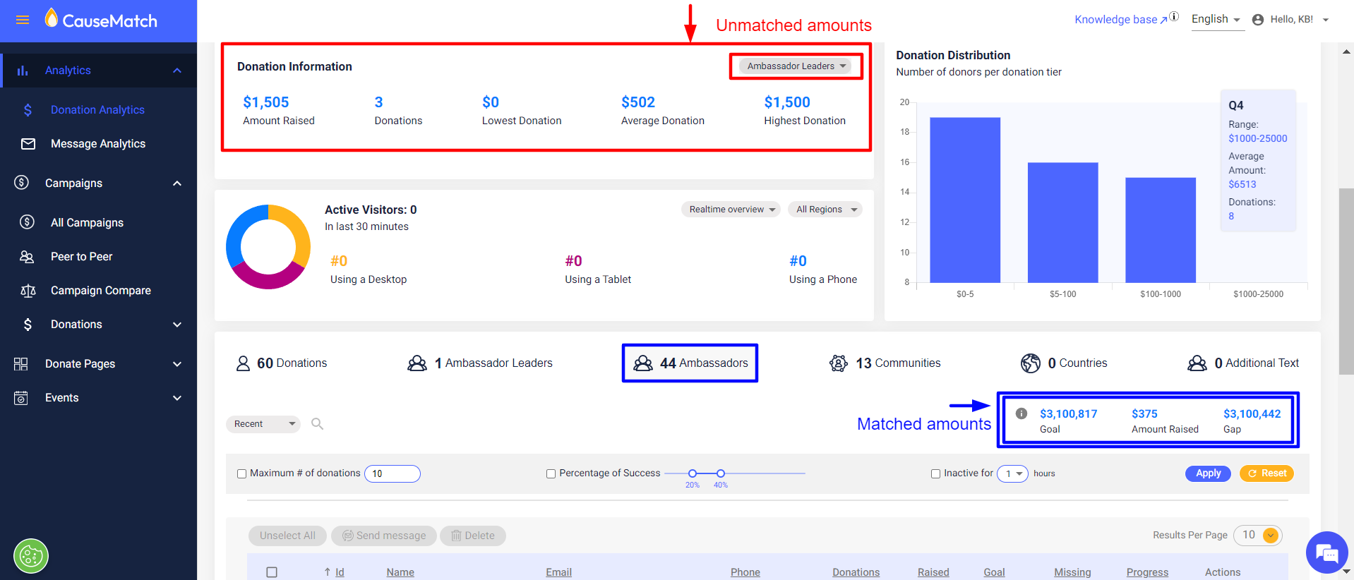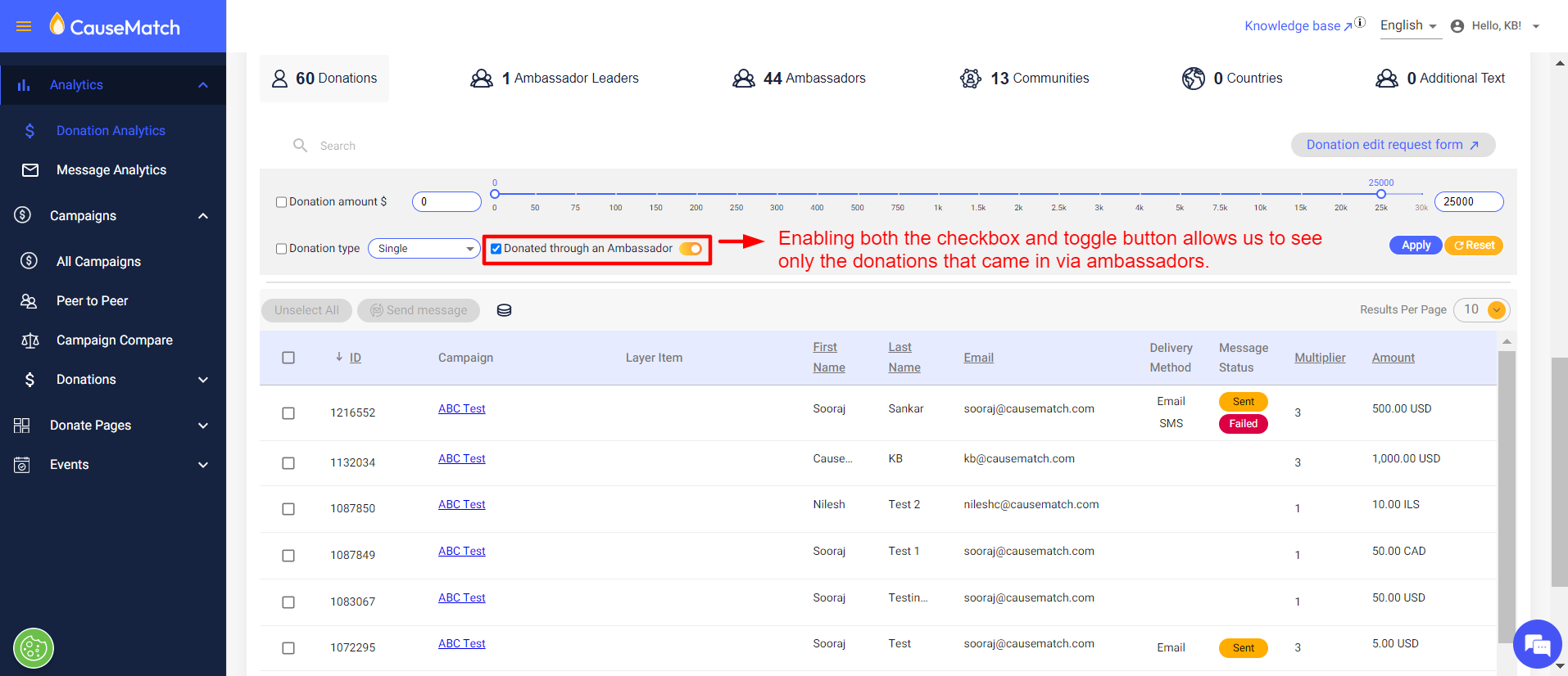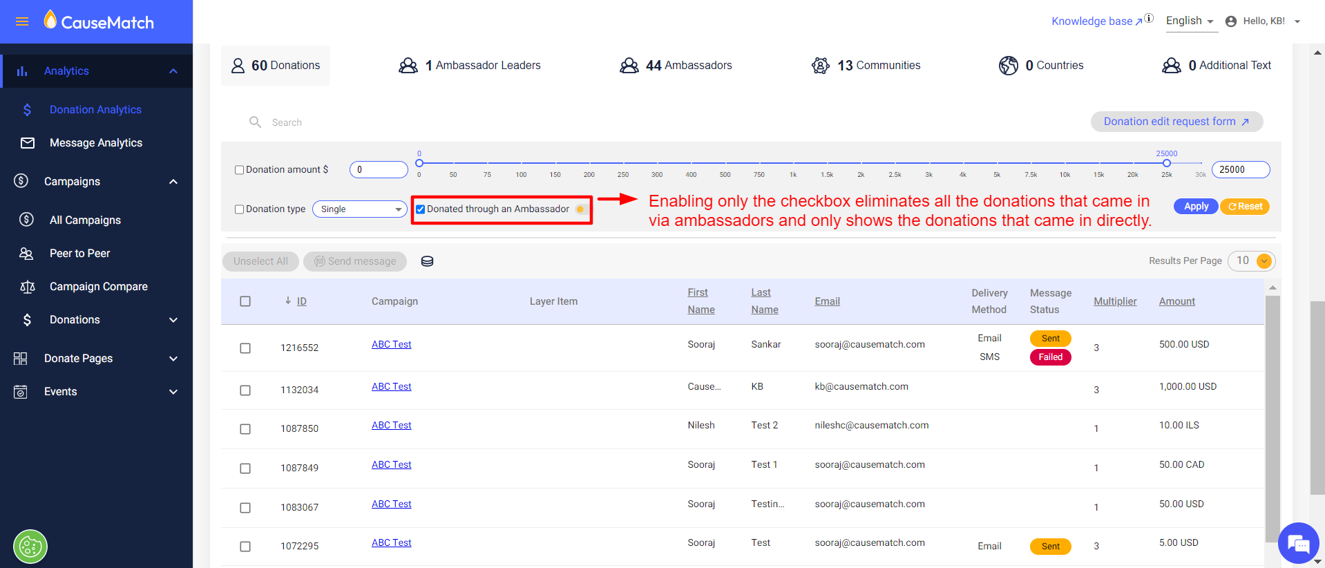 ‘Donated through an ambassador’ option to see the donations that came in through ambassadors only.