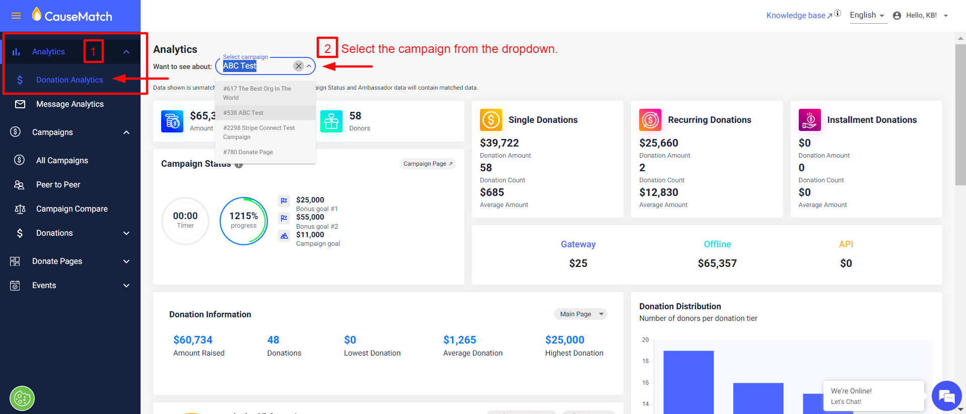Step 1: Once you have logged in to your dashboard, click on the ‘Analytics’ > 'Donation Analytics' section on the left-hand panel, & then type in the campaign name on the search bar to select the campaign, as shown on the below image.