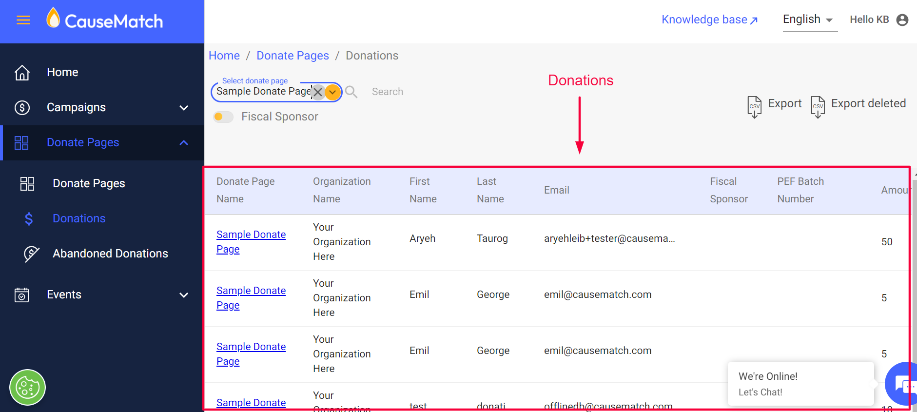Step 5: Once the donate page is selected, the donations will be displayed as highlighted below. In order to get a detailed information of the donations you can take the export of donations.