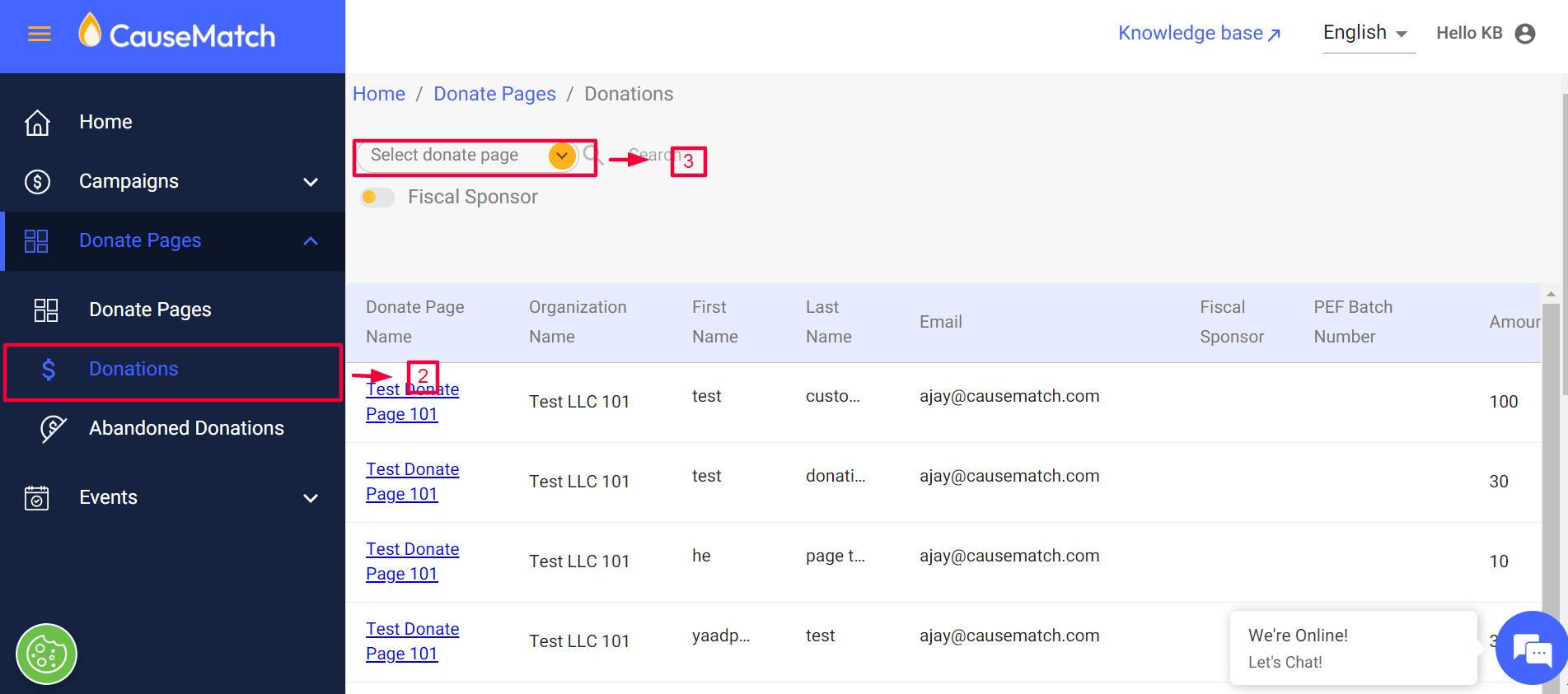 Login to your account dashboard through this link: https://causematch.com/login , using the credentials shared with you. Click on ‘Donate Pages’ and select 'Abandoned Donations’. Please select your donate page title from the dropdown to see the ...