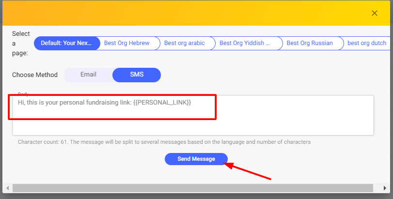 5. Once you click "Send Message", a popup will appear in which you can select the default page or other connected languages & then select the email or SMS feature.