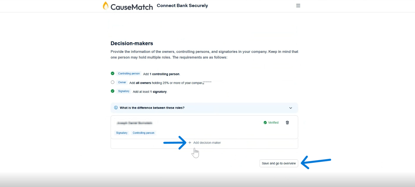 Repeat as needed until all required decision makers are added. Click "+ Add decision maker" to add more or click "Save and go to overview" for the next step.